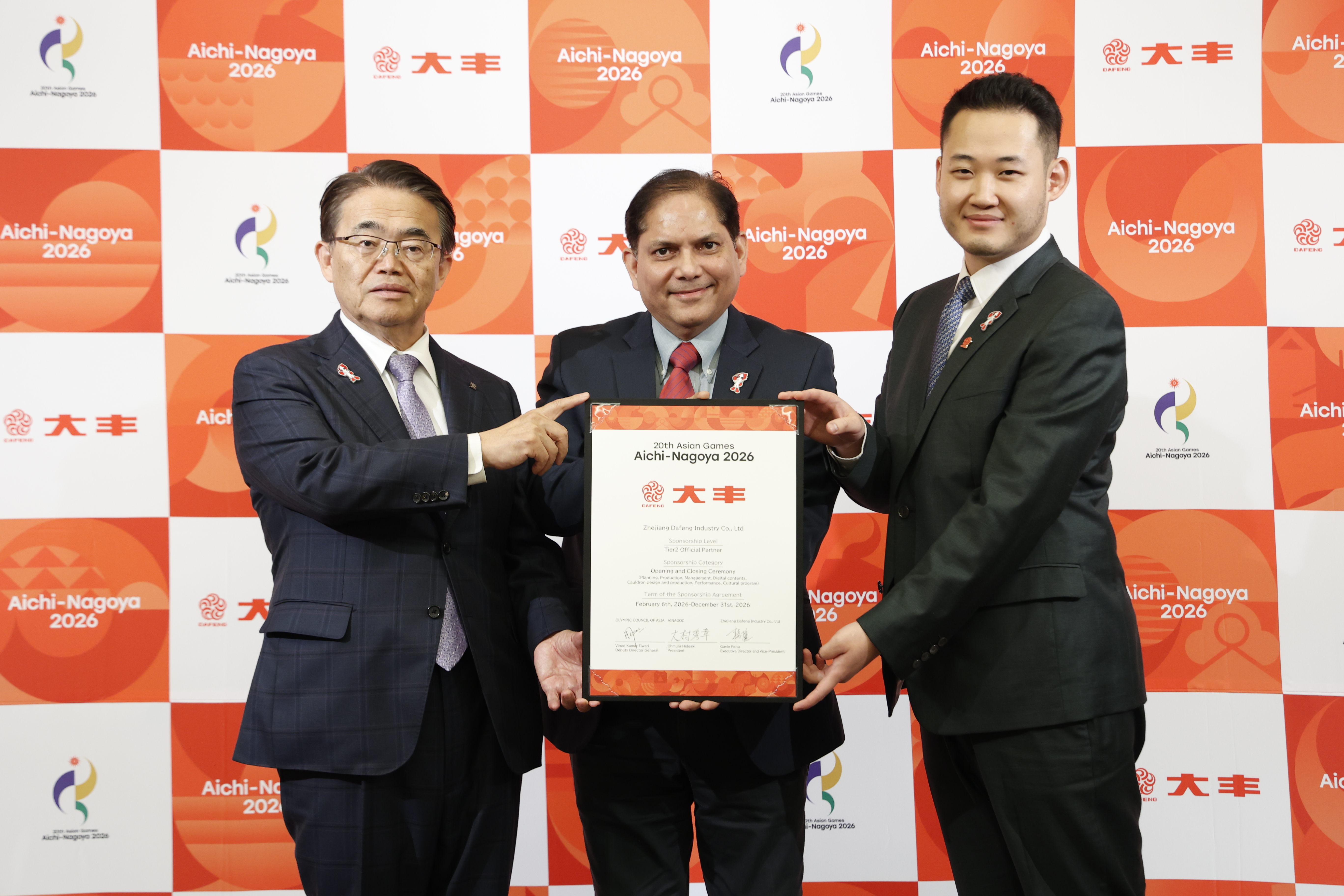 本日のパートナーシップは、単なる肩書ではありません。これは私たちの強いコミットメントです。ダーフェンは、愛知・名古屋2026アジア競技大会において、開閉会式の企画・制作、トーチデザイン、文化プログラムの支援など、多岐にわたり主催者および地域のパートナーと密接に連携してまいります。杭州 2022 アジア大会では象徴的な聖火台を制作しましたが、そこで培った創造性、革新性、実行力をこの大会にも遺憾なく発揮し、アジアが「一つの鼓動」で共鳴する大会を実現することが願いです。
