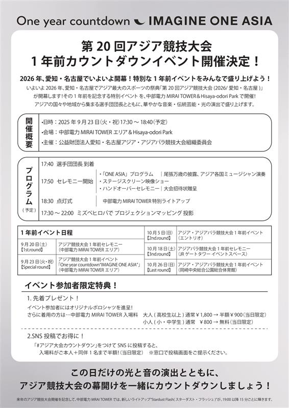 公益財団法人愛知・名古屋アジア・アジアパラ競技大会組織委員会では、2026年に愛知・名古屋で開催する第20回アジア競技大会・第5回アジアパラ競技大会の開催1年前を迎えるにあたり、開催都市と連携して、1年前イベントを開催します。5つの取組のうち、特に、9/23(火・祝)は、アジア競技大会に出場する各国の選手団団長にも参加していただき、開催都市と一体的にカウントダウンイベントや伝統芸能の演奏などを通じて、大会の広報・PRを行います。参加は無料です。皆様の御来場をお待ちしています!