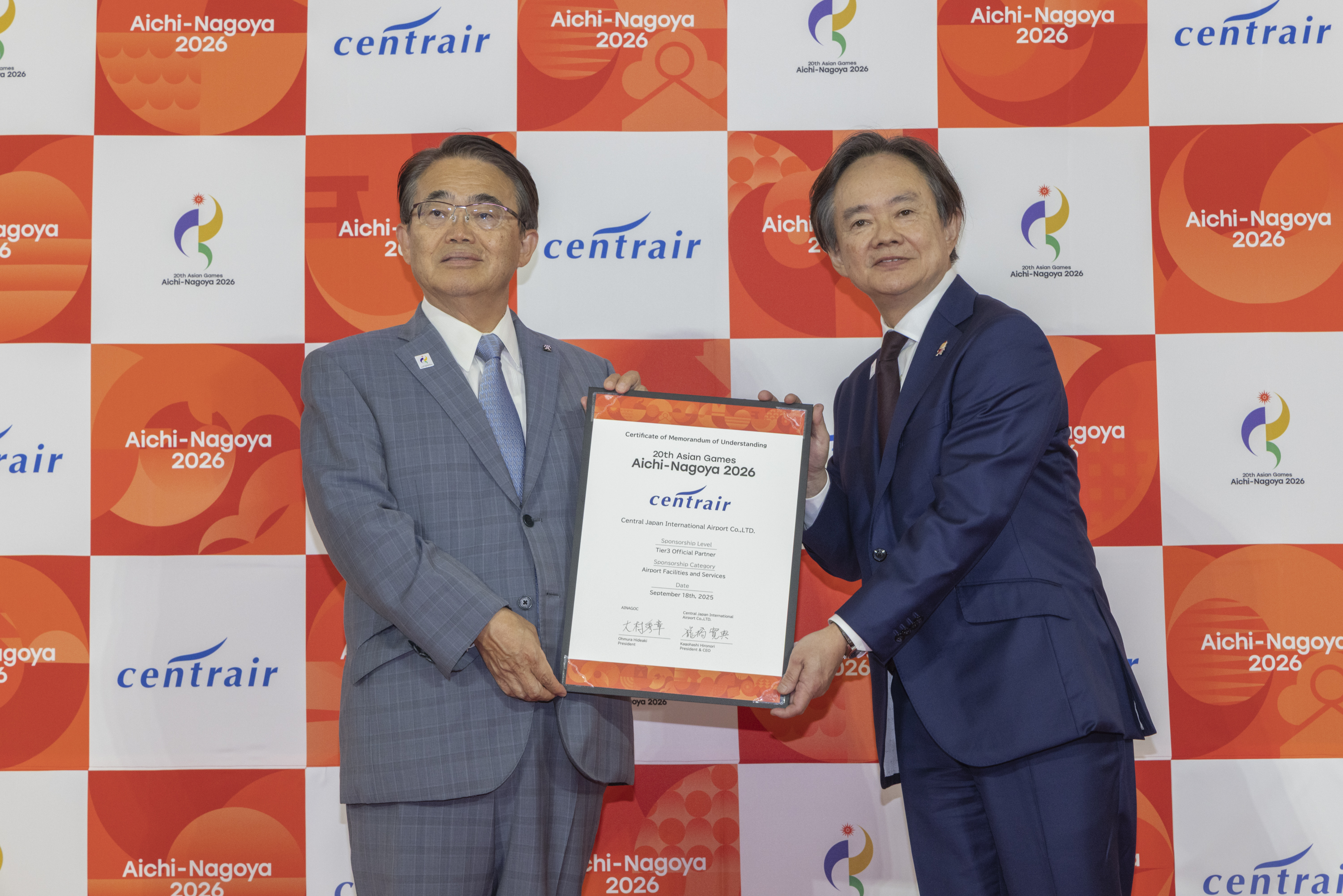 公益財団法人愛知・名古屋アジア・アジアパラ競技大会組織委員会は、中部国際空港株式会社と、第20回アジア競技大会(2026/愛知・名古屋)のパートナーシップ契約に関する覚書を締結し、記念セレモニーを開催しました。