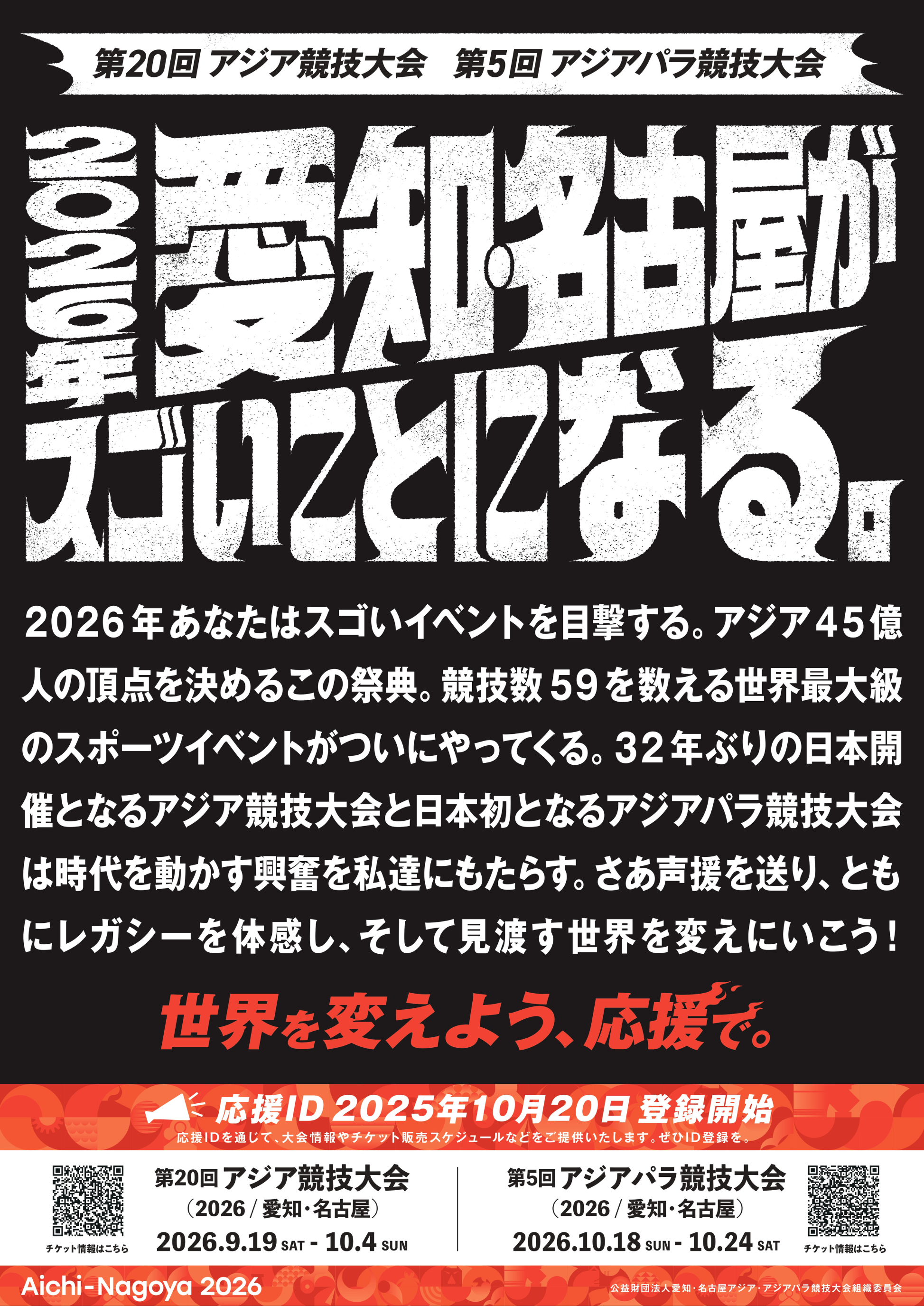 公益財団法人愛知・名古屋アジア・アジアパラ競技大会組織委員会(以下、「組織委員会」という。)では、第20回アジア競技大会(2026/愛知・名古屋)及び第5回アジアパラ競技大会(2026/愛知・名古屋)(以下、「愛知・名古屋2026大会」という。)の開催に向けて、大会の魅力や観戦チケットの販売情報をより多くの方に届けるため「応援ID」を創設しました。