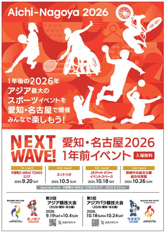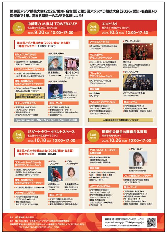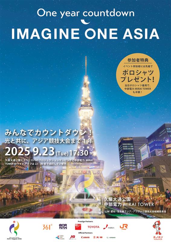公益財団法人愛知・名古屋アジア・アジアパラ競技大会組織委員会では、2026年に愛知・名古屋で開催する第20回アジア競技大会・第5回アジアパラ競技大会の開催1年前を迎えるにあたり、開催都市と連携して、1年前イベントを開催します。5つの取組のうち、特に、9/23(火・祝)は、アジア競技大会に出場する各国の選手団団長にも参加していただき、開催都市と一体的にカウントダウンイベントや伝統芸能の演奏などを通じて、大会の広報・PRを行います。参加は無料です。皆様の御来場をお待ちしています!