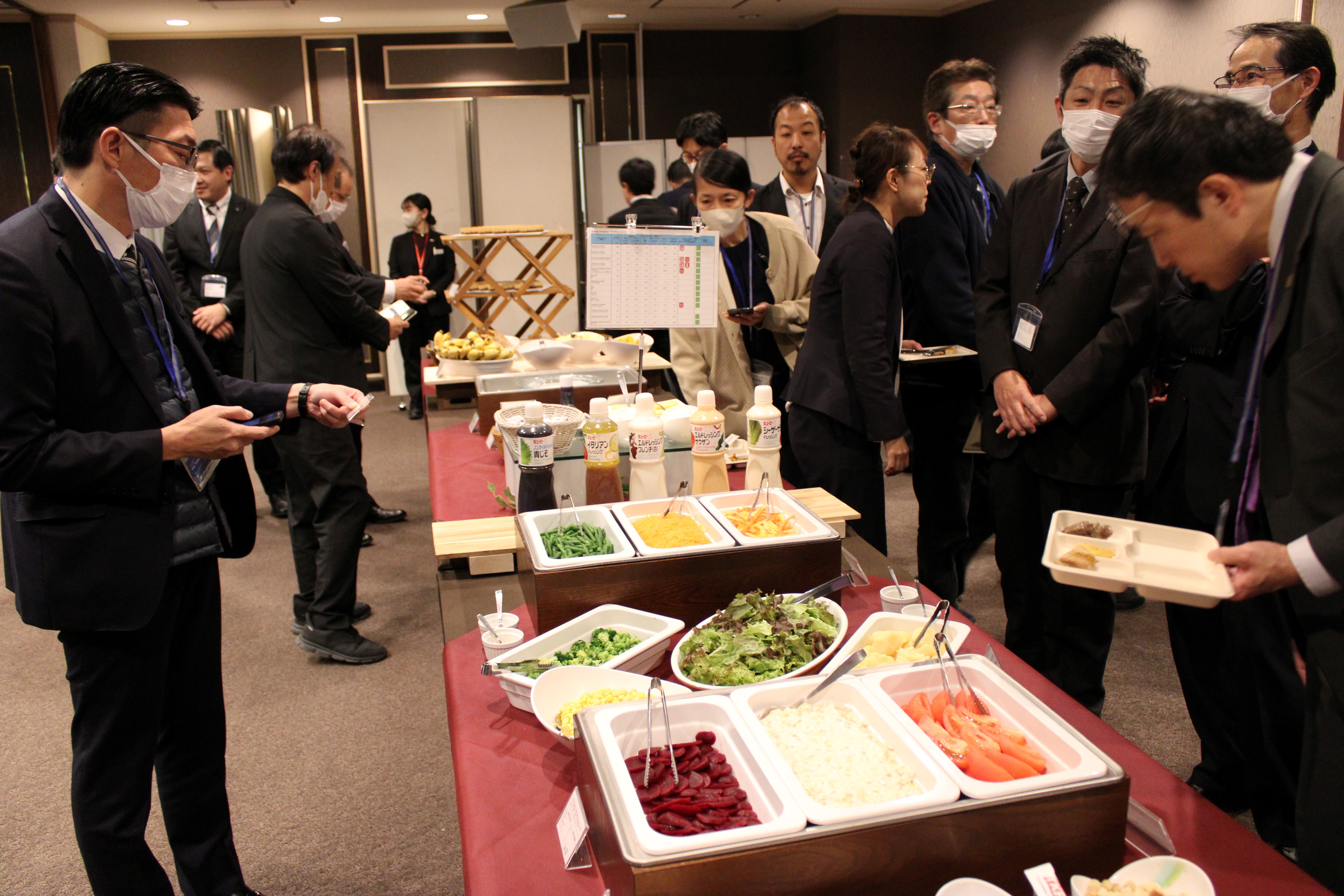 また、大会時の宿泊施設での飲食提供にならい、提供メニューの一部をビュッフェ形式で用意し、コンサルタントと共に配膳時の注意点などを確認しながら試食を行いました。